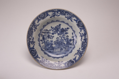 Wit diep bordje met op de lip een bruine lijn. Op de rand en op het plat fletsblauwe bloemdecoraties met in het midden twee staande personen. (Nederlands)