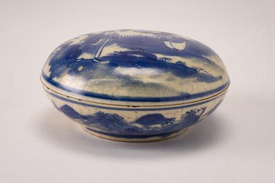 Afgeplat rond steatiet-achtig schminkdoosje met deksel. Hierop blauwe landschapdecoraties met op het deksel twee personen.