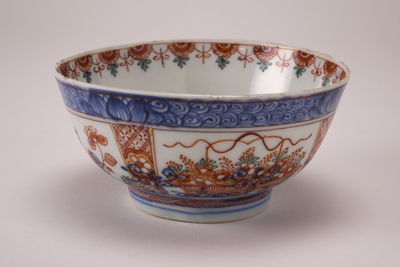 Amsterdams bont kommetje met langs de binnenrand een bloemenband in ijzerrood en groen. Aan de buitenzijde een blauwe band langs de bovenrand. Hieronder In emaille over gedecoreerd met o.a. hengselmanden en vogeltjes. (Nederlands)