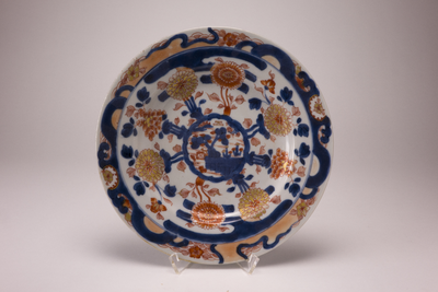 Imari bord met op het plat goudkleurige en ijzerrode bloemen.