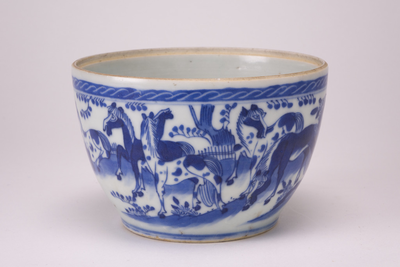Groen witte kom (zonder deksel?) met ongeglazuurde bovenrand. Op de buitenzijde een blauw landschapdecor met vijf paarden.