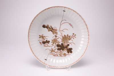 Wit bord met gelobde rand en langs de rand een sierrandje en op het plat een melk en bloed bloemdecor.