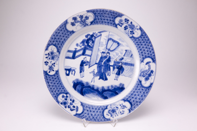 Wit plat bord met blauwe brede rand met hierin zes uitsparingen met blauwe bloemdecors. Op het plat in blauw een huisinterieur met vier personen en een ree.