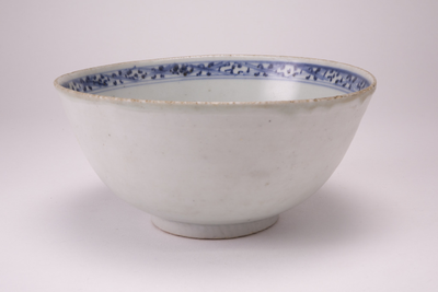 Grijs blauwe kom met aan de binnenzijde langs de rand en op de bodem blauwe decoraties, Van Diepencollectie, JMD-P-1752 |