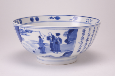 Bowl on footring, spreading sides. Decorated in underglaze with a long text in kaishu (Chinese standard script) and a river scene with three scholars on the bank. Around the inside of the rim a band with eleven motifs, namely millet, a water plant, the shou character, the moon (with a hare pounding the Elixir of Life), two ceremonial vessels, fire, an axe, a constellation of seven stars, mountains, the sun (with a bird), and a pheasant. Inside on the base a square motif surrounded by eight other shapes. On the base the six-character mark Qiyu baoding zhi zhen (a gem of a precious vessel made of rare jade). (Engels)