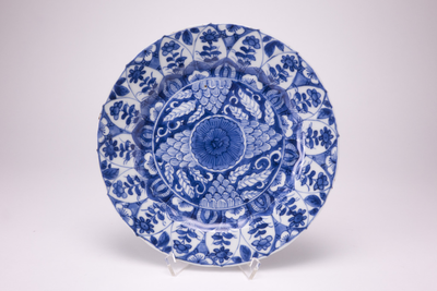 Wit reliëfbord met puntjesrand en druk bloemdecor. De 16 punten op de rand zijn het uiteinde van bloemblaadjes welke zelf ook weer gedecoreerd zijn met een bloemtakje. Het plat heeft centraal een bloem met daaromheen diverse baderen. (Nederlands)