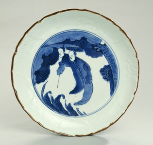 Schotel op voetring, spreidende wand met gemodelleerde nier-vormige medaillons en wolkmotieven in laag reliëf, licht geschulpte bruine rand. Onder op de bodem drie proen-moeten. De buitenkant van de wand met schuin-vertikale afdraairibbels. Versierd in onderglazuur blauw met twee figuren onder een pijnboom, de linker met een parasol. De wand is onbeschilderd. Onder op de bodem een rechthoekig fuku (geluk) merk. (Nagawara kiln) (Nederlands)