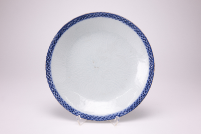 Wit bord met blauw gedecoreerde rand. Het bord is in reliëf gedecoreerd met bloemen. (Nederlands)