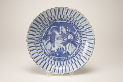 Wit bord met gelobde en gegolfde rand. In iedere lob een blauw streepje. Op het plat een voorstelling in blauw met reeen. (Nederlands)