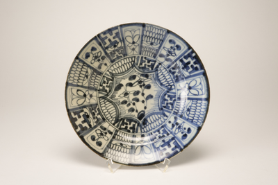 Blauw wit bordje met op de lip een bruine lijn. Op de rand zestien kleine vlakjes met blauwe decoraties. Op het plat in een stervormig kader met een bloemdecoratie in blauw. (Nederlands)