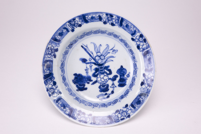 Wit diep schoteltje met op de binnenzijde blauwe decoraties o.a. op het plat een vaas met bloemen, een tafeltje en een plantenbakje. Hier omheen een smalle blauwe sierrand. Op de de rand een brede decoratieband met bloemen. (Nederlands)