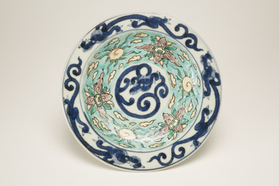 Witte platte schotel met op de rand en in het midden blauwe draken. Op het plat lichtgroene en lichtpaarse decoraties met wolken en parels. (Nederlands)