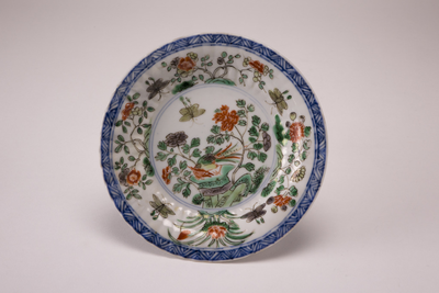 Wit gelobd schoteltje met blauwe rand en hierbinnen fijne famille verte decoraties met bloemen vogels en vlinders.