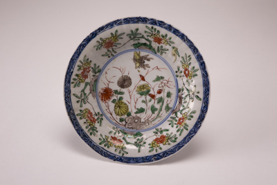 Wit gelobd schoteltje met blauwe rand en hierbinnen fijne famille verte decoraties met bloemen vogels en vlinders, Van Diepencollectie, JMD-P-1779 |