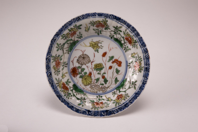 Wit gelobd schoteltje met blauwe rand en hierbinnen fijne famille verte decoraties met bloemen vogels en vlinders.