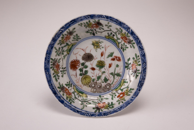 Wit gelobd schoteltje met blauwe rand en hierbinnen fijne famille verte decoraties met bloemen vogels en vlinders.