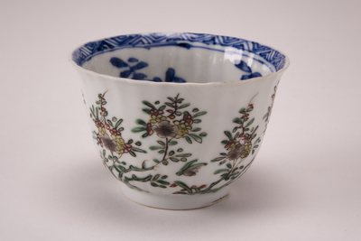 Wit gelobd kommetje met blauwe rand en op de buitenzijde fijne famille verte decoraties met bloemen vogels en vlinders.