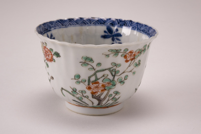 Wit gelobd kommetje met blauwe rand en op de buitenzijde fijne famille verte decoraties met bloemen vogels en vlinders, Van Diepencollectie, JMD-P-1786 |