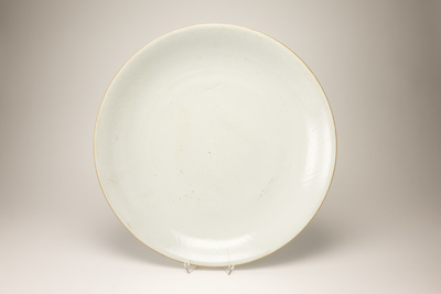 Grote vlakke schotel met een egaal grijs-witte glazuurlaag en op de lip een dunne bruine lijn.