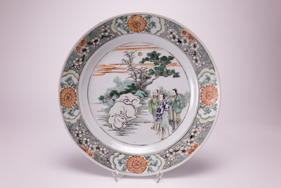 Dish on footring, flat rim. Famille verte, decorated in overglaze enamel colours with differing shades of green, yellow, blue, iron-red and black. In the centre a landscape with three figures watching two white oxen resting in the grass near rocks and trees. In the sky drifting clouds and a moon. On the rim four flowering prunus sprays and bamboo on a speckled ground, alternating with four lobed panels with a stylised flower and scrolls. The reverse is undecorated. (Engels)