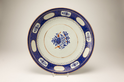 Grote witte schotel (Lowestoft?) met op de lip een bruine lijn. Langs de rand een donkerblauw sierrand met goudkleurige sterretjes en tien uitsparingen met in vijf een bloemdecoratie. In het midden op het plat een bloemdecoratie in blauw, goud en ijzerrood. (Nederlands)