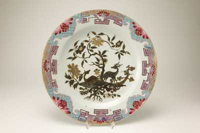 Groot wit bord met op de rand een famille rose servetdecor. Op het plat een lakmoes met goud hertendecor.