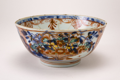 Amsterdams bont kom op standring. Op de binnenzijde een blauwe onderglazuur band en een ijzerrode guirlande. Op de bodem een hengselmand. Op de buitenzijde witte uitsparingen met hierin een hengselmand of een landschapje over de blauwe decoratie. (Nederlands)