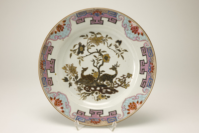 Wit bord met op de rand een famille rose servetdecor. Op het plat een lakmoes met goud hertendecor. (Nederlands)