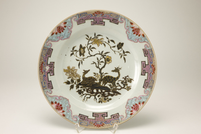 Wit bord met op de rand een famille rose servetdecor. Op het plat een lakmoes met goud hertendecor.