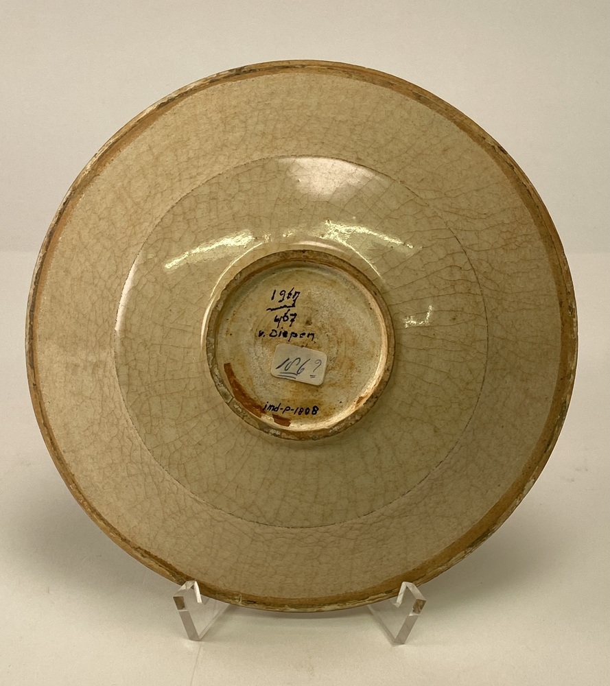 Kom van Siamees steengoed. Crêmekleurige, gecraqueleerde kom met ongeglazuurde bovenrand. Onder het glazuur een ingegrifte lotusbloemtak. De messing ring ontbreekt. (Song)||JMD-P-1808||China||Onbekend||JMD-P-1808 |