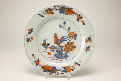 Imari bord met op de rand en op het plat bloemdecoraties in blauw, oranje en goud. Op het plat nog een haan en een hen.