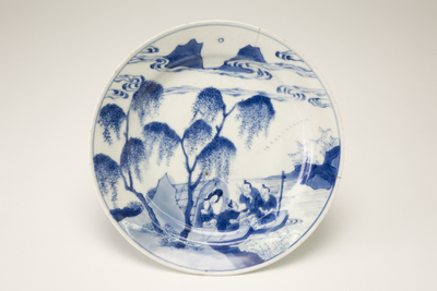 Wit bordje met blauw landschapdecor met daarin twee bootjes met drie etende mannen en een Chinese vrouw met kind op haar schoot, Van Diepencollectie, JMD-P-1815 |