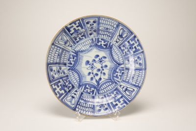 Blauw wit bordje met op de lip een bruine lijn. Op de rand 1zestien kleine vlakjes met blauwe decoraties. Op het plat in een stervormig kader met een bloemdecoratie in blauw.