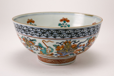 Amsterdams bont kom met Op de bodem een bloemdecor met een chinese vrouw kijkend vanuit een raam naar een tuin met bloemen op een rots, Van Diepencollectie, JMD-P-1822 |