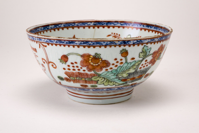 Amsterdams bont kom op standring met op de bodem een blauwe bloem en langs de binnen en buitenrand een blauwe band. Aan de onderkant oo een blauwe band. Hiertussen aan de binnen- en buitenzijde meerkleurige bloemdecoraties met vogels in ijzerrood, groen en goud. (Nederlands)