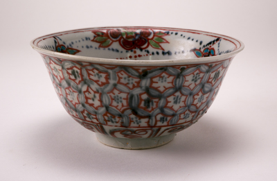 Grijswitte gecraqueleerde kom met de buitenzijde geheel versiert in donkerblauw en ijzerrood. Aan de binnenzijde bloemdecoraties in blauw, groen en ijzerrood. (Nederlands)
