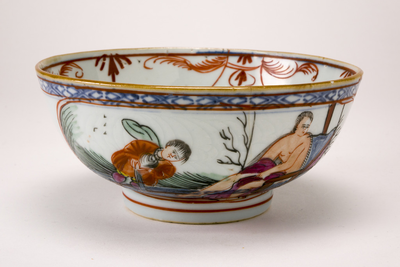 Chinese kom met langs de binnenrand een ijzerrode guirlandeversiering. De bodem is overgedecoreerd met een groene tak met een ijzerrode bloem. Op de buitenzijde een grof geschilderde meerkleurige Europeesche voorstelling van een badende vrouw zittend in een stoel met een assistent. Aan de achterzijde een een bloemtak met een meerkleurige vogel. (Nederlands)