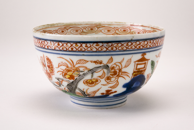 Imari kommetje met op de buitenzijde een rots en een huisje met daaromheen ijzerrode- en Famille verte bloemdecoraties.