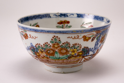 Amsterdams bont kommetje op standring. Op de bodem een boeket op een tafeltje. Lang de binnenrand een blauwe band. Op de buitenzijde bloemenmanden en hekwerk.