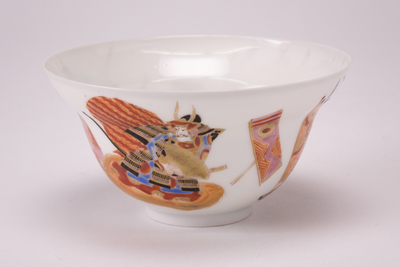Wit Satsuma eierschaal kopje met op de buitenzijde drie krijgers in meerdere kleuren, Van Diepencollectie, JMD-P-1864 |