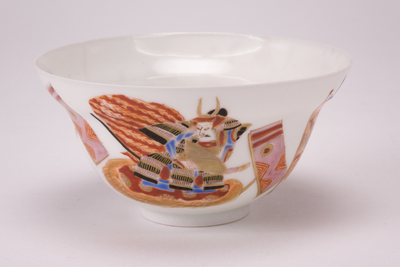 Wit Satsuma eierschaal kopje met op de buitenzijde drie krijgers in meerdere kleuren, Van Diepencollectie, JMD-P-1865 |