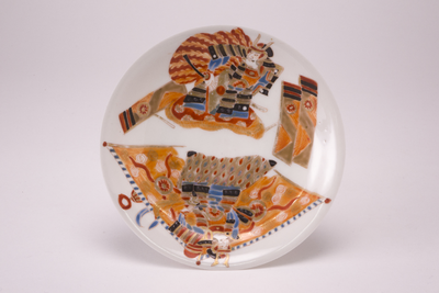 Wit Satsuma eierschaal schoteltje met op het plat twee krijgers in meerdere kleuren.