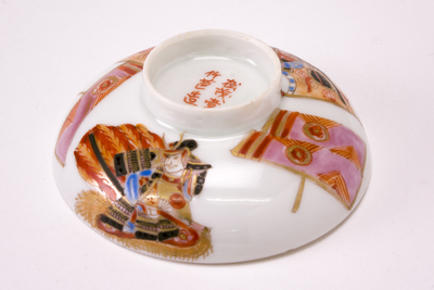 Wit Satsuma eierschaal dekseltje met op de buitenzijde twee krijgers in meerdere kleuren.