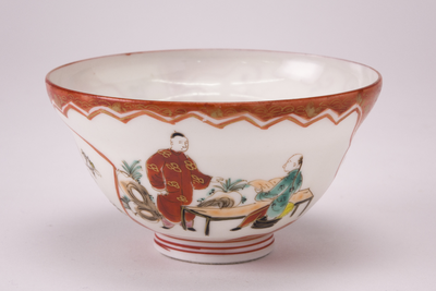 Wit eierschaal kopje met op de buitenzijde drie cartouches met daarin een vaas met takken, twee personen aan een tafen en 1 persoon met waaier in meerdere kleuren, Van Diepencollectie, JMD-P-1893 |