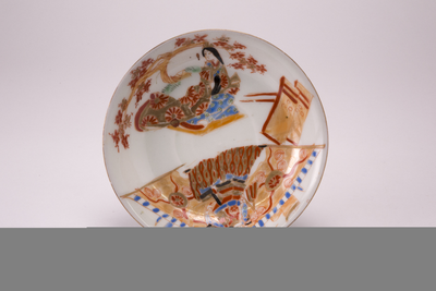 Wit schoteltje met ijzerrode rand en op het plat drie cartouches met daarin een landschapje met bloemen en vogel, drie personen aan een tafel en in de laatste 1 zittende persoon en twee staande personen in meerdere kleuren. (Nederlands)