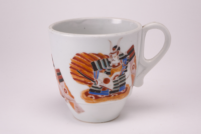 Grote witte mok met oor en op de buitenzijde een zittende krijger en een staande krijger in meerdere kleuren.