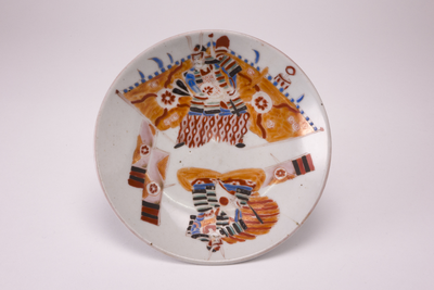Schotel met dikke scherf en op het plat een zittende krijger en een staande krijger in meerdere kleuren, Van Diepencollectie, JMD-P-1916 |