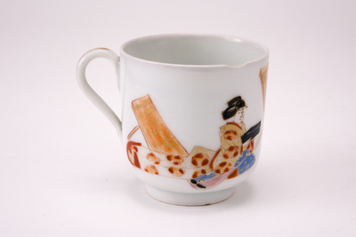 Wit kopje met oor en op de buitenzijde een zittende vrouw onder een boom en een staande krijger in meerdere kleuren, Van Diepencollectie, JMD-P-1919 |