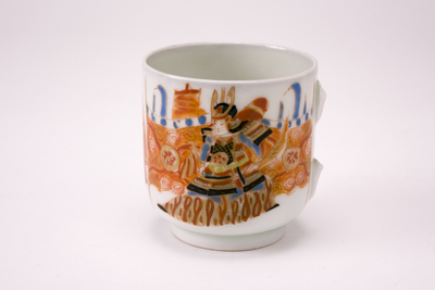 Wit kopje met oor en op de buitenzijde een zittende vrouw onder een boom en een staande krijger in meerdere kleuren.