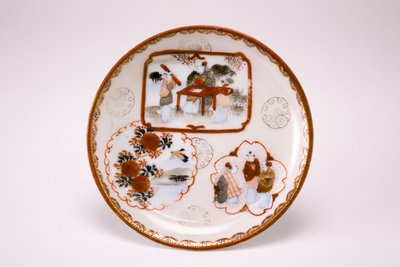 Wit schoteltje met ijzerrode rand en op het plat drie cartouches met daarin een landschapje met bloemen en vogel, drie personen aan een tafel en in de laatste 1 zittende persoon en twee staande personen in meerdere kleuren. (Nederlands)